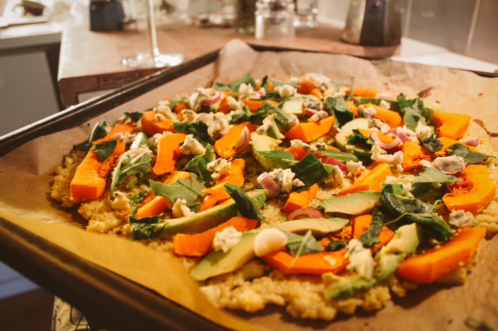 Onnistuin tekemään niin huikean hyvää pizzaa, että pakko jakaa resepti kanssanne. Inspiraatio lähti edellisenä päivänä avatusta punaviinistä, jonka seuraksi piti keksiä illallinen. Punaviinin ja kasvisruuan yhdistäminen tuotti minulle päänvaivaa kunnes googlailujen jälkeen löysin tämän reseptin. Päätin kuitenkin sotkea tähän vielä pohjan kukkakaaliversiosta, jota olen aikaisemmin jo kokeillut. Lopputulos oli uskomattoman täydellinen!
